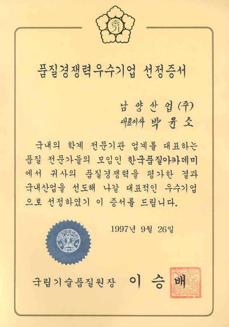 19970926-품질경쟁력 우수기업 선정증서