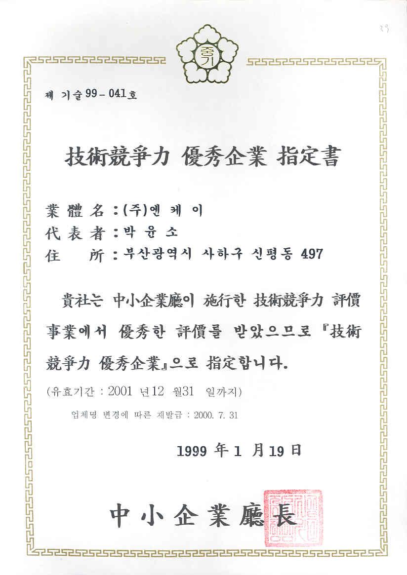 19990119-기술경쟁력 우수기업 지정서